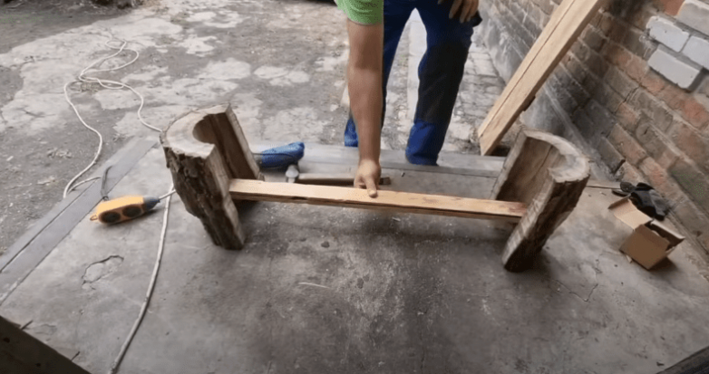 Между ножками-пеньками для надежности устанавливаем перекладину, закрепляем ее при помощи любого крепежа.