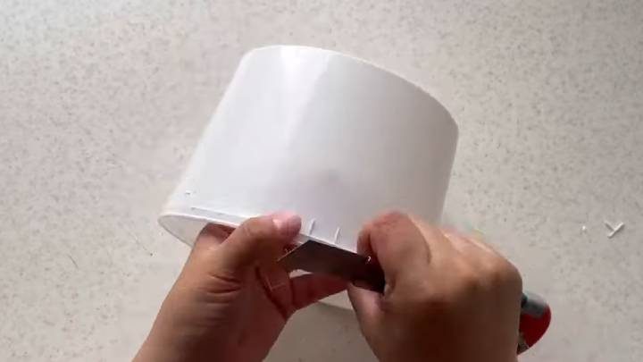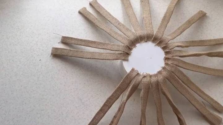Ведёрко зачистите от ручки и выступающих частей пластика. Мешковину нарежьте на полосы 5 см шириной.
