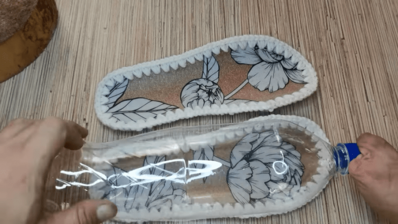 Сделав обвязку прозрачных заготовок, совмещаем их с нижней частью, а затем провязываем столбиком без накида соединительный ряд. Декоративные тапочки готовы.