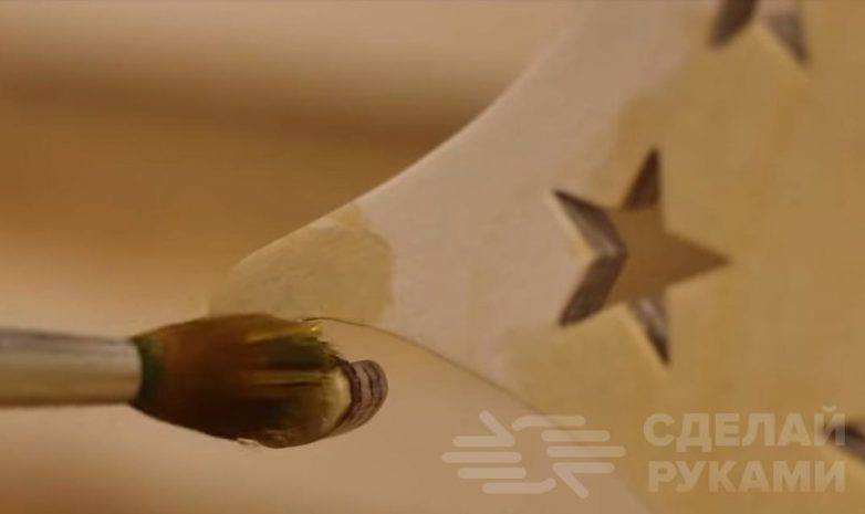 На следующем этапе необходимо добавить звёздочки. Для этого крупным сверлом проделайте отверстия в фанере посередине каждой будущей звезды.