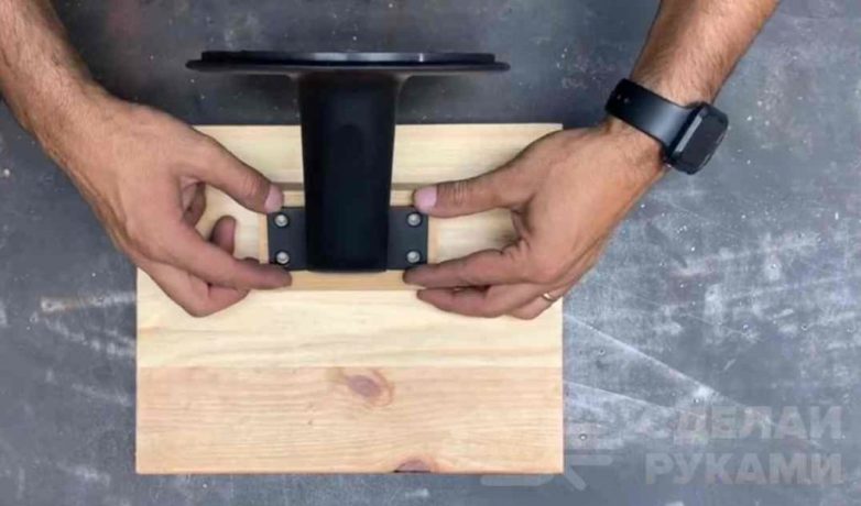 К тыльной стороне дощечки мастер крепит деревянный брусок, к которому затем будет прикручиваться пластиковое крепление от монитора.
