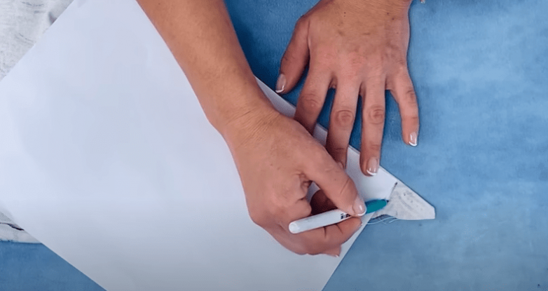 Далее с каждого угла складываем ткань так, чтобы сформировать угол в 45 градусов. Отмеренный угол затем прошиваем с края.