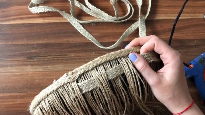 А затем сделайте плетение с помощью связанных полос из джута/пряжи. Рисунок может быть любым.
