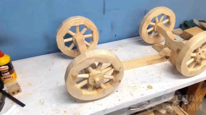 После того как колеса готовы, автор делает раму. Для этого опять же используются деревянный брусок. Переднюю ось мастер сделал подвижной, чтобы можно было направлять колеса в нужную сторону.
