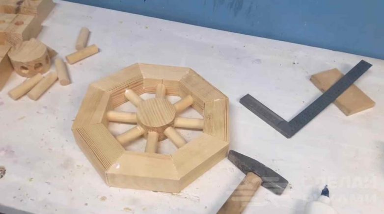 После этого автор приступает к сборке колес. В центральную часть колес вставляем спицы длиной по 7 см, потом надеваем на них восемь деревянных сегментов. Соединения промазываем клеем ПВА.