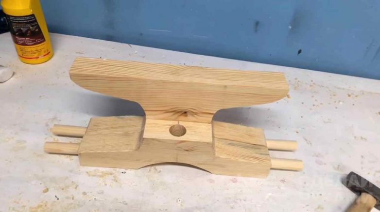 Чтобы можно было посадить колеса на оси, в центральной части автор сверлит отверстия диаметром 20 мм с помощью сверла Форстнера.