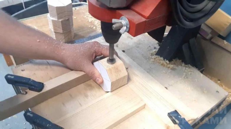 Напиленные заготовки необходимо отшлифовать, после чего с помощью сверла Форстнера автор сверлит в каждой из них отверстия диаметром 20 мм.
