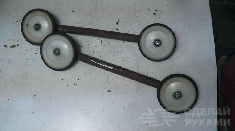 Далее отрезаем два куска круглой трубы, подходящих по длине, и крепим к ним колесики. Свариваем две боковые части основания между собой с помощью еще одного куска круглой трубы. Спереди привариваем платформу с двигателем.