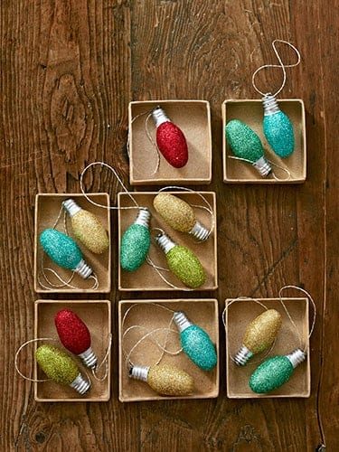 Возьмите старые лампочки намажьте их клеем ПВА и посыпьте блестками, чтобы получились сверкающие украшения