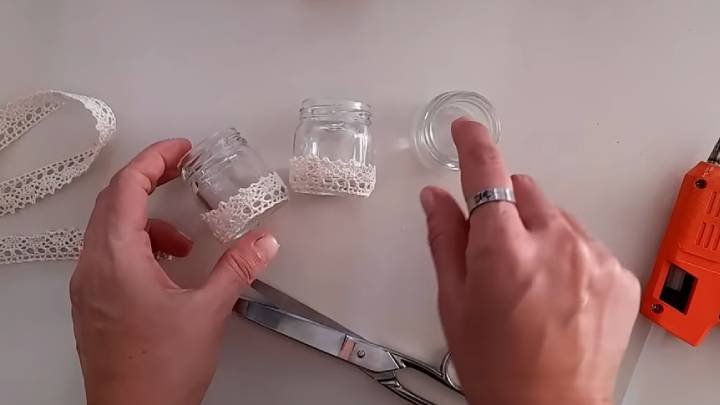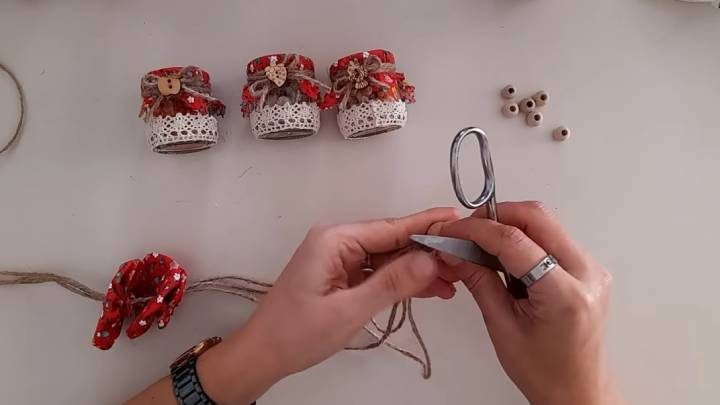 К низу баночек приклейте кружево. Разрежьте ткань на квадраты, приклейте к крышкам банок. Завяжите джутом вокруг горлышка.