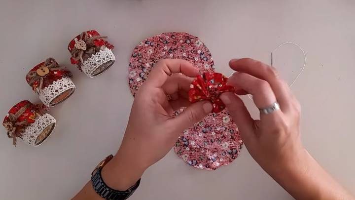 Нарежьте ещё несколько кусочков ткани, но уже круглых. Соберите ткань по краю иголкой с ниткой, затяните.