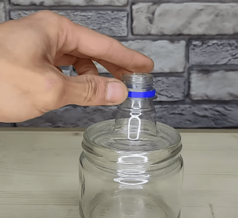 Всего-то и нужно надеть обрезанную часть бутылки на банку так, чтобы пластик огибал стенки, а затем обдуть по кругу мощным феном. При отсутствии фена можно просто погрузить банку с насадкой в емкость с закипающей водой на 10-15 секунд. Этого будет достаточно, чтобы пластик дал усадку. В таком случае придется предварительно прогреть банку, чтобы стекло не треснуло.