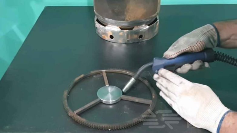 В дне баллона также надо просверлить сквозное отверстие. Затем венец маховика необходимо будет посадить на вал, который вставляется в отверстие в баллоне и обваривается.