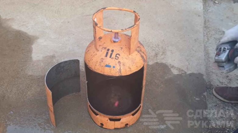 После этого автор вырезает в баллоне дверцу — вырезает болгаркой часть стенки и приваривает на петли. На другой стороне дверцы устанавливаются защелки.