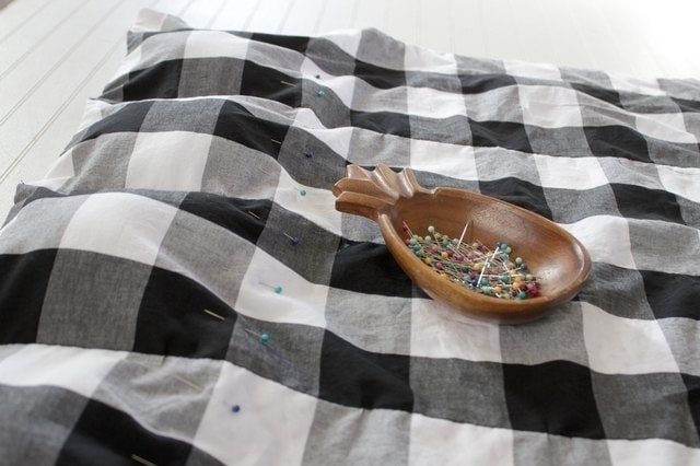 Положите два отреза ткани лицевыми сторонами друг к другу и соедините их с помощью портновских игл. Сострочите ткань по трем сторонам с подгибом 1,5 см.