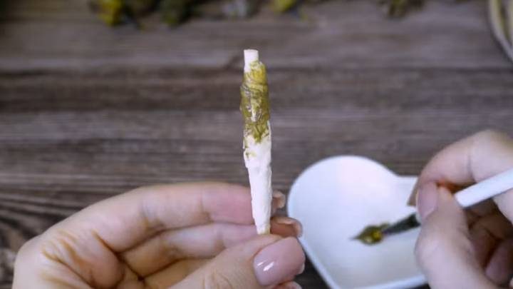 Деревянную шпажку или палочку для суши укоротите вполовину. Заклейте малярным скотчем, чтобы сделать толще, покрасьте коричневой краской. Из фольги сформируйте конус с загнутым концом. Вставьте шпажку в фольгу.