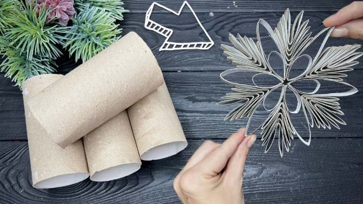 Всё, что нужно для создания этой снежинки, — это картонные втулки от туалетной бумаги! В конце готовую снежинку можно покрасить в желаемый цвет и даже присыпать блёстками.