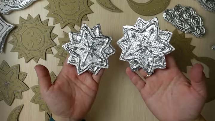 Сделайте самые бюджетные, доступные и лёгкие ёлочные игрушки просто из картона, фольги и клея! По желанию вы можете раскрасить готовые игрушки акриловыми красками или оставить их серебристыми, как фольга.