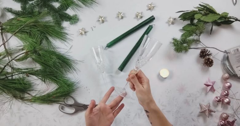 Для работы понадобятся бокалы для шампанского, флористическая губка, толстая металлическая проволока, веточки хвойных деревьев и декоративные элементы.