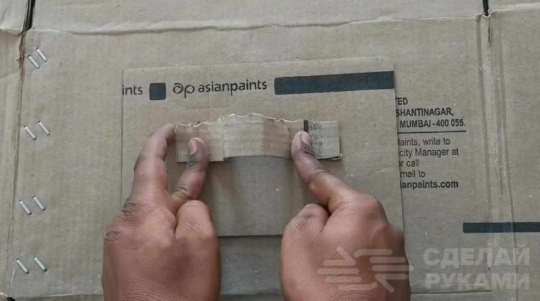 Потом нужно отрезать еще один небольшой кусок картона, и сделать из него ручку. Ее нужно закрепить к прямоугольному куску при помощи скотча.