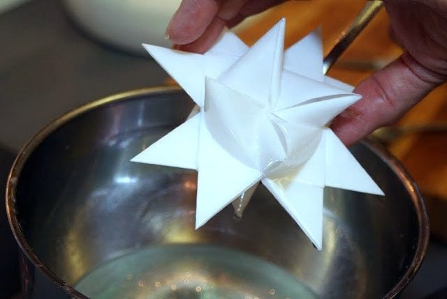 Когда он расплавится, осторожно опустите бумажную звезду в расплавленный воск и дайте воску покрыть звезду
