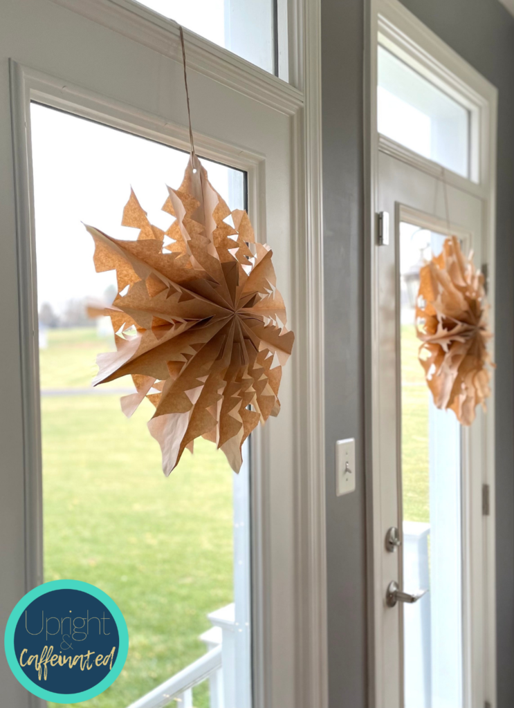 Наконец, если вы хотите повесить снежинки из бумажных пакетов, вы можете использовать дырокол, чтобы пробить отверстие в верхней части и протянуть веревку. Они такие красивые, и их можно использовать где угодно.