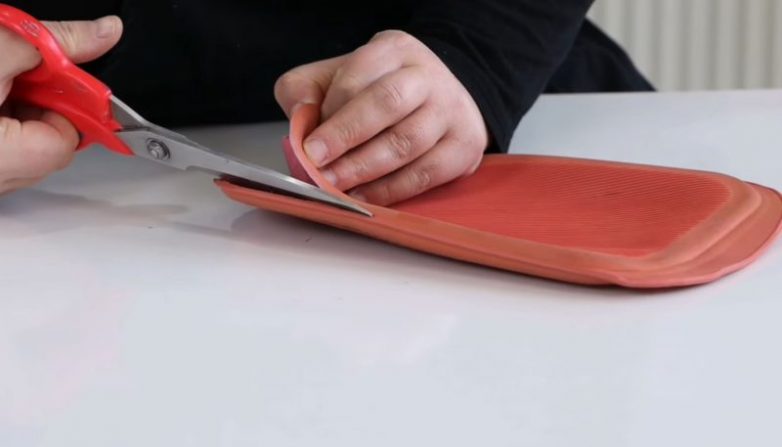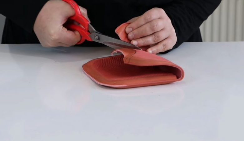 Аккуратно срежьте резину в нижней части грелки, чтобы придать сумочке аккуратные очертания.