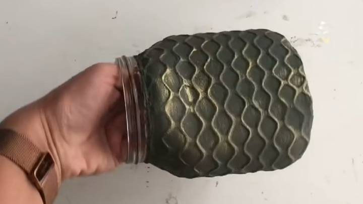 Берём крышку, подходящую для банки. Красим в тот же цвет. Затем в ней вырезаем отверстие. От старого дозатора мыла выкручиваем винтовой механизм, вставляем в крышку, с внутренней стороны проклеиваем горячим клеем для фиксации. Закручиваем крышку. Дополнительно поделку желательно закрепить лаком.