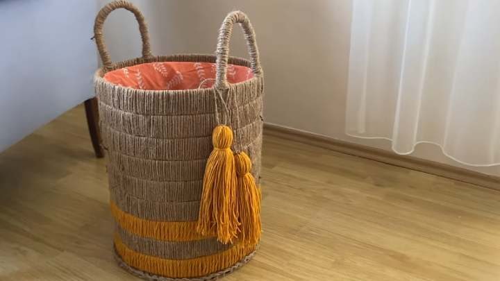 Подробнее о том, как сделать корзинку из картона, джута и пряжи, смотрите в видео ниже: