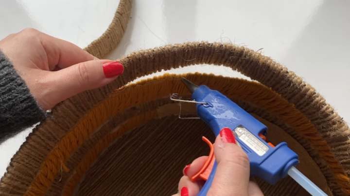 К кругу приклейте поочерёдно картонные кольца из джута и пряжи. В конце приклейте ручки.