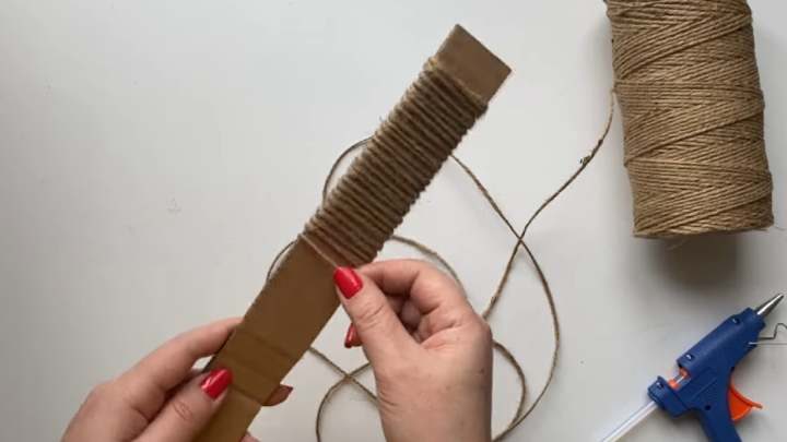 Нарежьте картон на полосы шириной 4 см. Длина не имеет значения. Оберните полосы джутом.