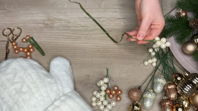 Следующий этап работы творческий: используйте для декора искусственные еловые веточки, небольшие шарики, шишки и другой декор по вашему вкусу. Для крепления небольших декоративных элементов удобно использовать проволоку, которую в случае необходимости можно выгнуть в любую сторону, что позволит создать красивую композицию.