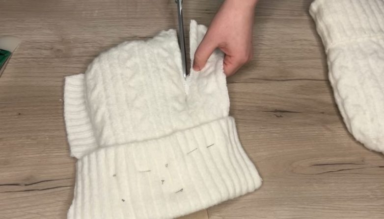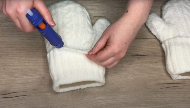 Для того чтобы основание не просвечивало, покрасьте его белой краской и оставьте до полного высыхания. После высыхания краски приклейте к основе вязаное полотно. Не забудьте сделать подворот в нижней части варежки.