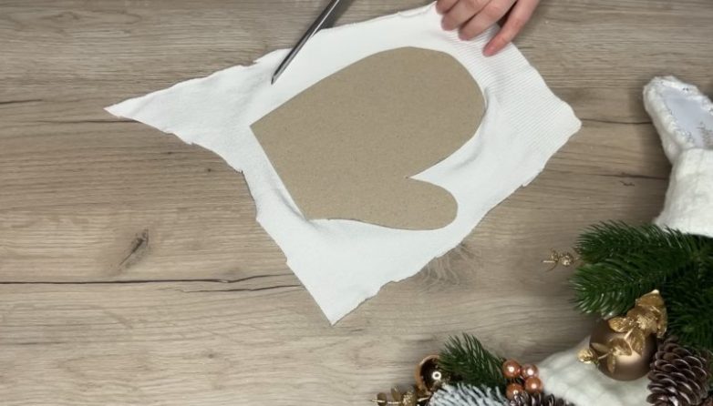 Для оформления обратной стороны варежки используйте заготовку из картона немного меньшего размера. Обклейте заготовку тканью.