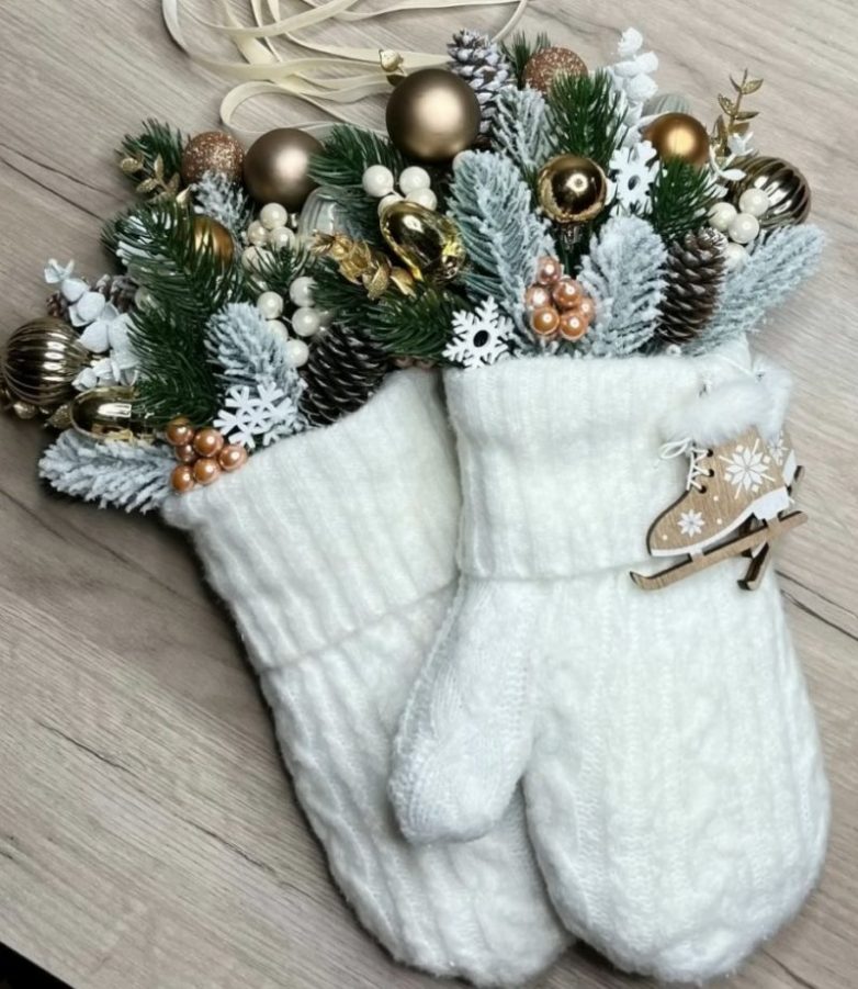 Прекрасной альтернативой классическому новогоднему венку станет оригинальная праздничная композиция в варежках.