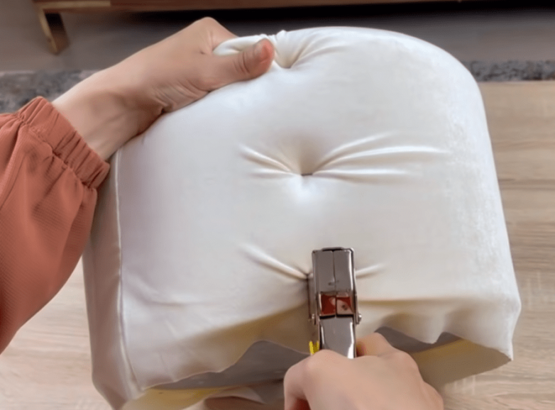 Двигаясь по кругу, находим места надрезов и прикрепляем ткань к основе при помощи степлера. По мере работы расправляем и натягиваем ткань.