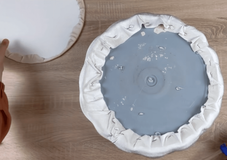 Аналогично формируем внешнее донышко, но теперь обтягиваем тканью не поролон, а картон или тонкий пенопласт. Закрепляем донышко к основе, обильно смазав поверхность клеем.