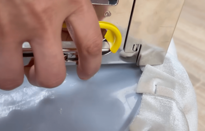 Берем подходящую ткань, в идеале бархат или атлас. Чтобы не делать замеры, просто оборачиваем ведро, а затем отрезаем нужное количество. Формируем трубу, сшиваем ткань по стыку удобным способом. Закрепляем и разравниваем тканевую заготовку на внутренних стенках, а ту часть, которая приходится на внешние стенки равномерно распределяем и временно оставляем незакрепленной.