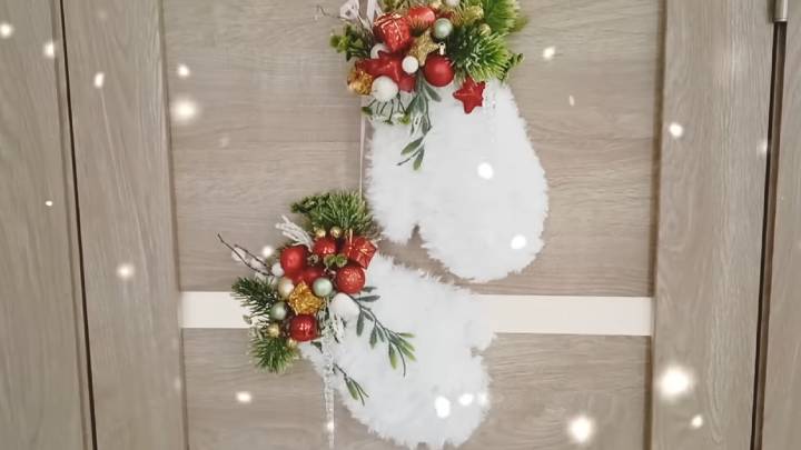 Подробнее о том, как сделать новогодний декор «Пушистые варежки», смотрите в видео ниже: