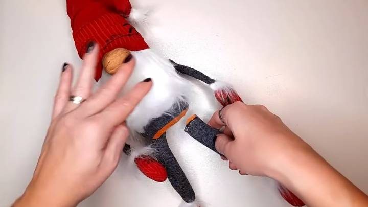 Сверху на конус наденьте ещё один носок — красного цвета. Ниткой завяжите кончик, чтобы он был пригнут. В качестве носа можно просто приклеить грецкий орех.