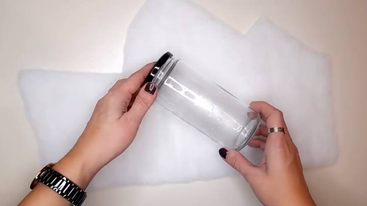 Банку оклейте синтепоном или каким-нибудь утеплителем. Из фоамирана склейте конус, лишнее обрежьте.