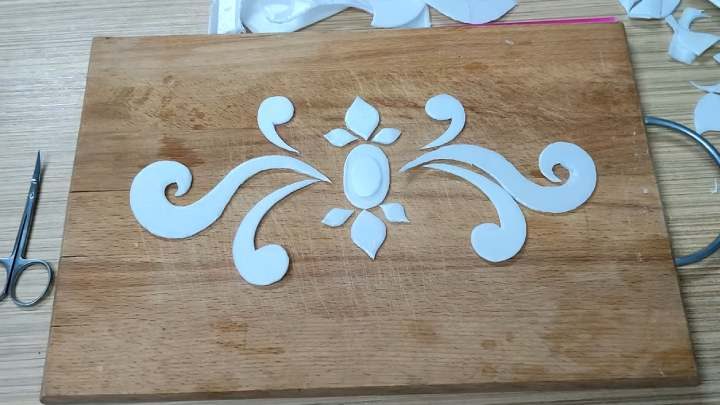 Чтобы добавить камину декоративности, хорошо приклеить вензеля. Сделать их можно из обычных одноразовых контейнеров. Просто вырезать нужную форму и приклеить!