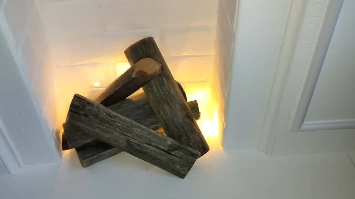 Полжите дрова, сзади которых спрячьте небольшую гирлянду на батарейках.