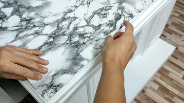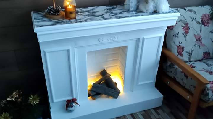 Столешницу фальшкамина лучше всего заклеить самоклеящейся плёнкой. Тогда камин будет эстетично выглядеть, и уборка облегчится.