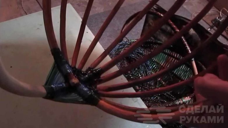 Чтобы ребра каркаса не сильно отличались от ПЭТ веревки по цвету, автор покрасил их морилкой.