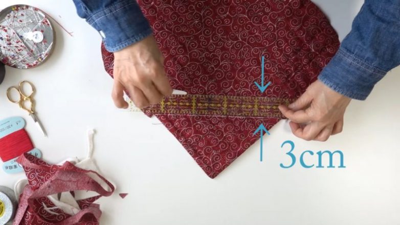 Разметьте положение кармана во внутренней части сумки. Соедините прямой линией крайние точки строчки и отступите вниз 3 см.