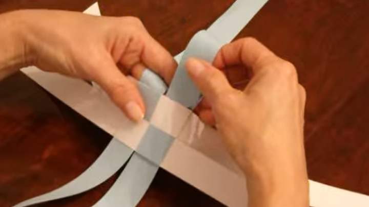 Третью расположите сбоку справа, на второй полоске, сгибом вверх. Четвёртую — справа снизу, сгибом на третьей полоске. Саму четвёртую полоску проденьте через первую.