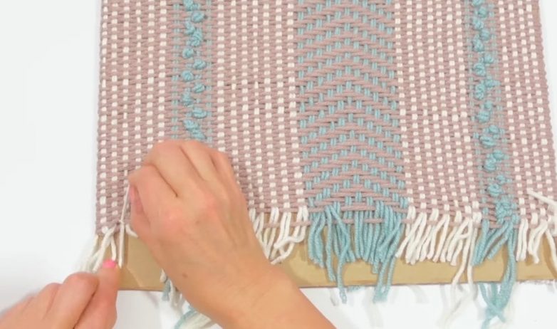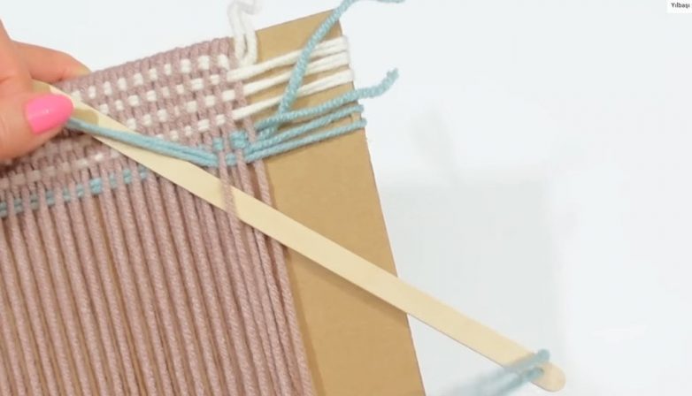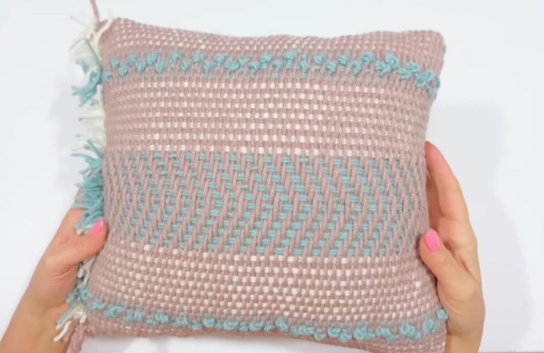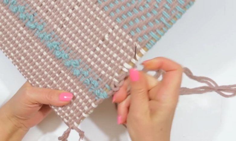 Для плетения задней стороны наволочки просто протяните иглу с пряжей под всеми основными нитями.