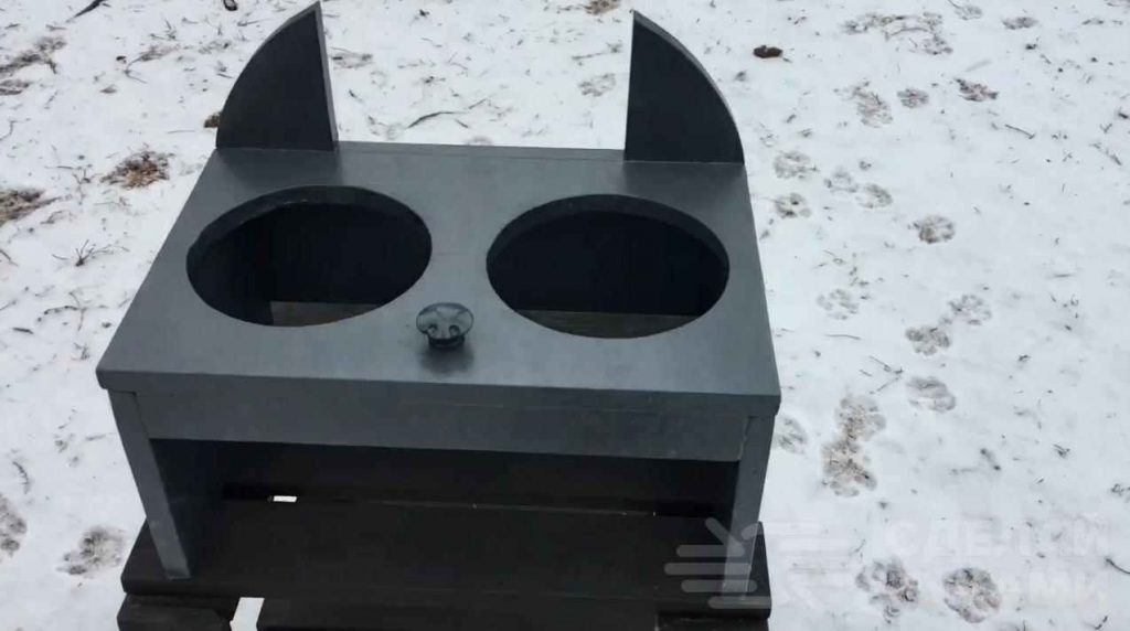 После сборки получается небольшой столик, в котором удобно помещаются емкости с едой и водой для вашего питомца. Для создания стилизованного вида можно приделать к конструкции «ушки» и «нос», делающие кормушку похожей на морду собаки.