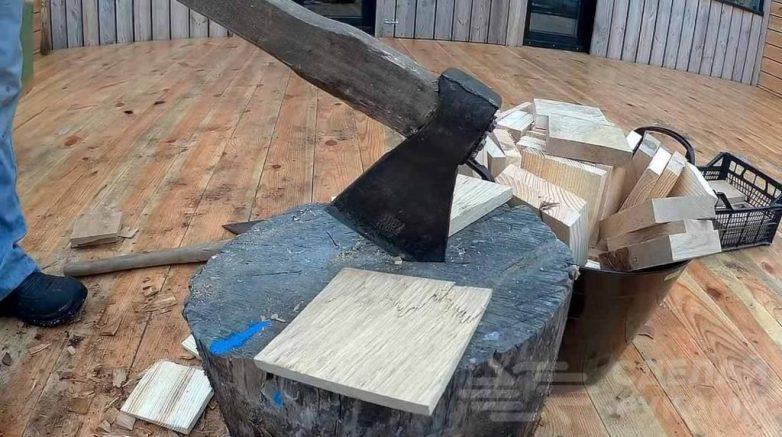 Далее напиленные квадратные плитки нужно расколоть вдоль на две части (пополам). Для этого потребуется топор и молоток. Это позволит получить плитки с оригинальной фактурой.